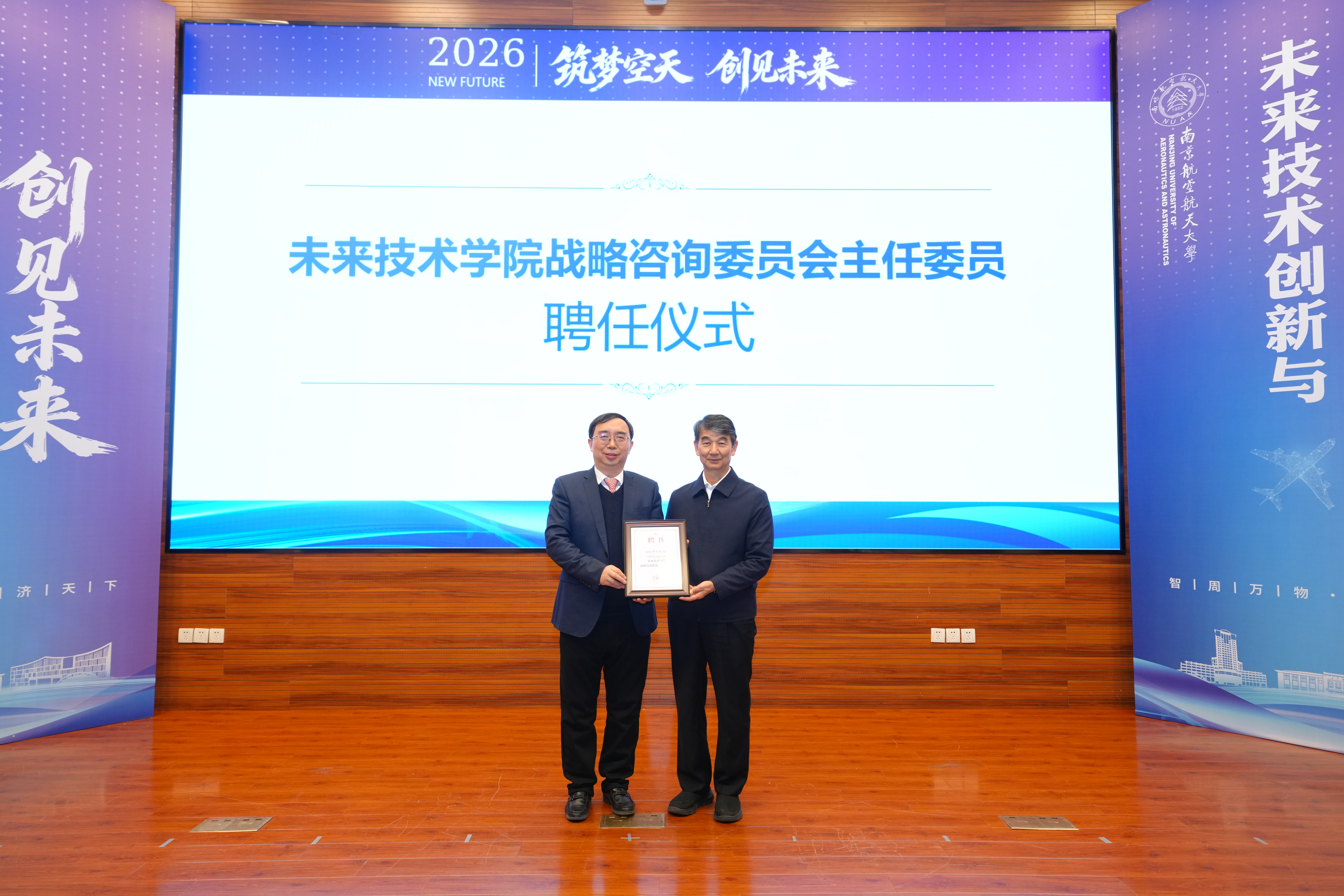 为汇聚顶尖智慧,引领学院高质量发展,组建了未来技术学院战略咨询委员会,并现场聘任郭万林担任主任委员。姜斌为郭万林颁发了聘书。委员会汇聚了包括郭万林、朱广生、郑海荣等在内的9位顶尖专家,将为学院的发展战略、学科方向、人才培养等提供高层次的咨询与指导。